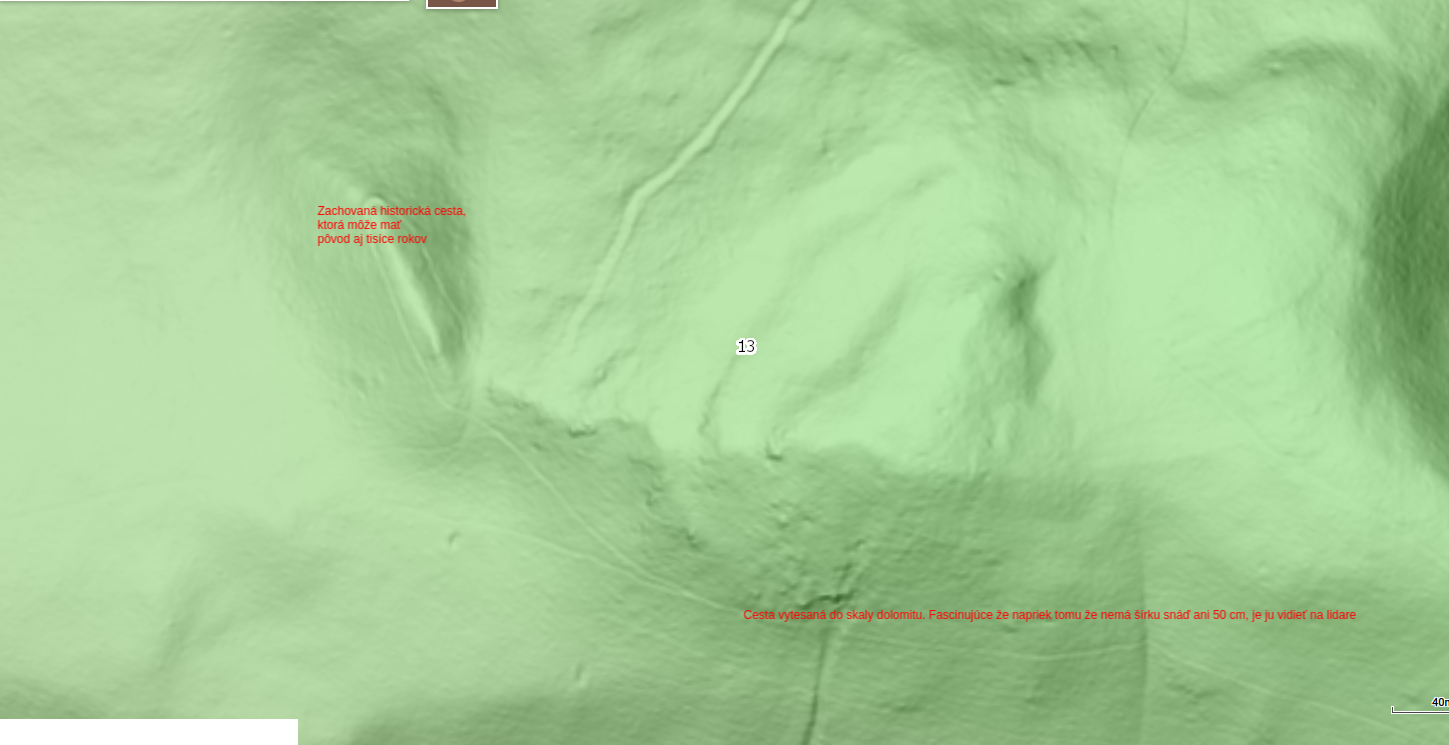 The terrain shown in the image has a length of 750 m. It is a narrow, straight, ridge-like hill made of quartzites.