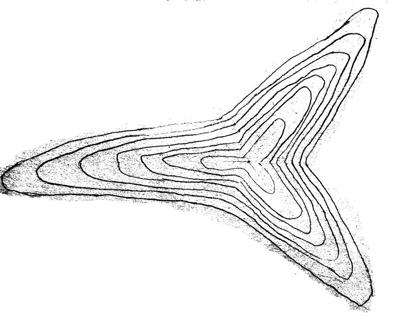 **** Energy emitter No. 3. This is an emitter with a very decent altitude. Its diameter is approximately 850-1000 meters. Its shape is such that 3 ridge-like hills converge into one point. It is a kind of “Mercedes-like hill”. The most energy is concentrated in the center. The entire hill is made of quartzite. An approximate conceptual drawing of the hill based on contour lines. (A contour line connects points with the same altitude).
