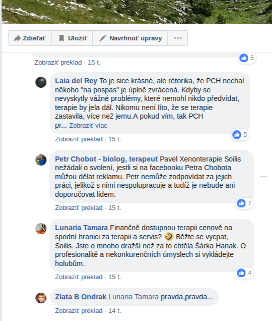 V minulosti videl Petr problém zasa u konkurenta, ktorý ponúkal xenónovú terapiu a tiež na svojej FB stránke () ľudí odhováral od tohto podnikateľa. Youtube kanál Cesty k Sobě zmazal video o xenónovej terapii. Dlho som nevedel o dôvode. Skutočný dôvod zdá sa bude v tom, že kvôli smrti Šárky xenónové terapie boli zrušené a tak robí teraz nepriamu reklamu svojmu konkurentovi. Chobot je prešpekulovaný vypočítavý špekulant a dobrý strategický hráč v poli biznisu.