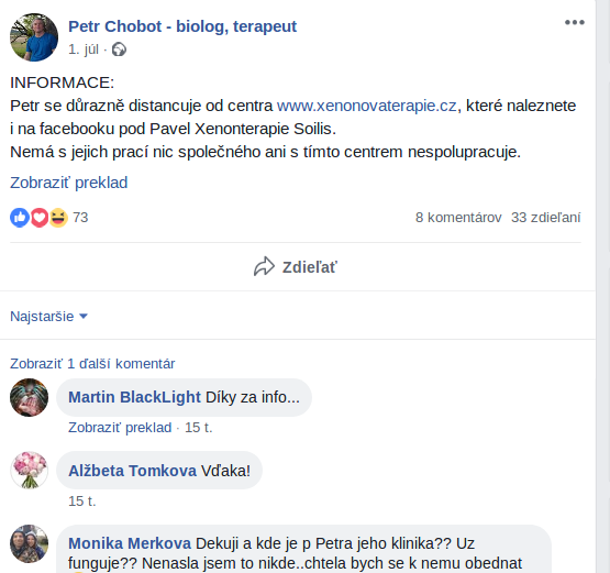 - Chobot má veľmi zvláštnu slabosť na ženy a rád ich zneužíva – tieto informácie mám potvrdené od viacero od nezávislých dôveryhodných svedkov. Tragikomický príklad toho je aj toto. Muži na jeho seminároch zjavne nie sú až tak veľmi vítaní – je to čudný úchyl. Rovnosť pohlaví Chobotovi asi nič nehovorí https://www.facebook.com/PetrChobotBiologTerapeut/photos/a.478995345514570/2431396110274474/?type=3&__tn__=-R