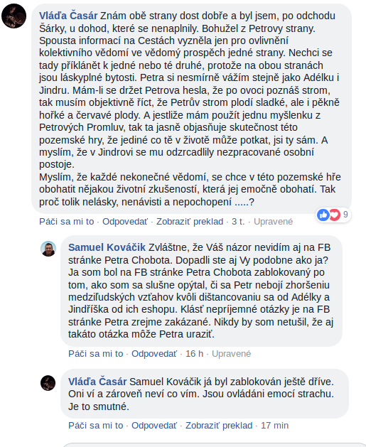 A teraz po dlhom úvode idem už konečne k téme. O smrti Šárky som sa dozvedel medzi prvými. Strata Šárky ako najväčšej spolupracovníčky Chobota musí byť pre neho veľká strata a utrpenie. Karma sa mu vrátila za jeho úžeru.
