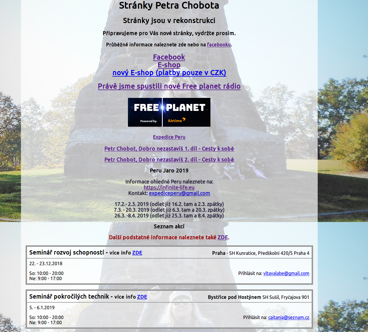 dovolte nám objasnit situaci okolo zrušení Petrových stránek a výstavby stránek nových. Staré webové stránky petr-chobot.eu byly zrušeny z důvodů zneužívání Petrova jména „týmem“ lidí, kteří prodávali Petrovy byliny pod jeho jménem v návaznosti na jeho stránky. Není udržitelné, aby se tak nadále dělo, a to z toho důvodu, že Petr nemá žádnou kontrolu nad mícháním a kvalitou bylinných směsí, jejichž výrobu a prodej si tito lidé přivlastnili po tragickém úmrtí Petrovy spolupracovnice Šárky Hanak.